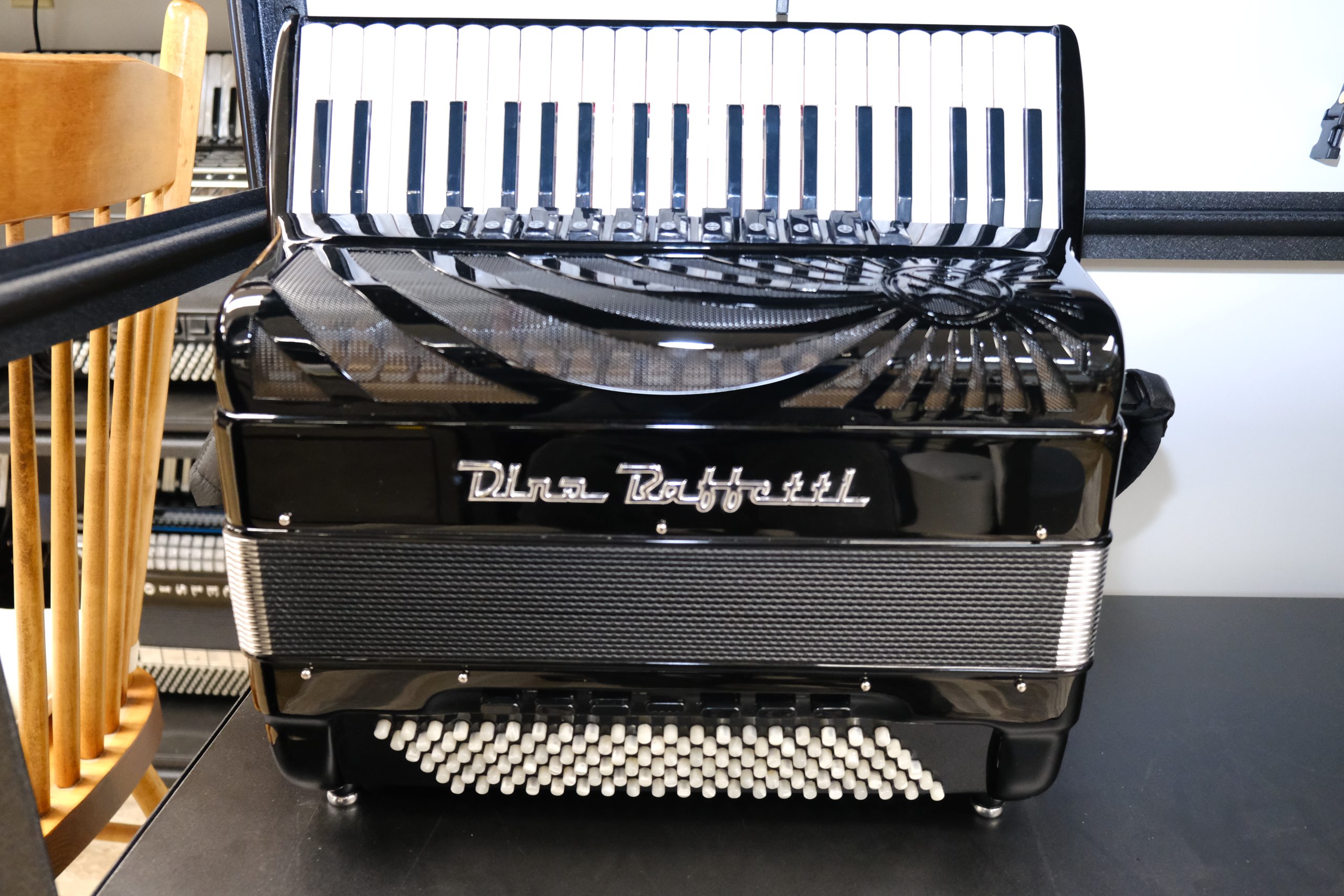 Dino Baffetti Concerto III. 4/5 sets of hand made BINCI reeds in double tone chamber. LMMH. 11/7 registers. Black finish with mother of pearl keys and buttons..