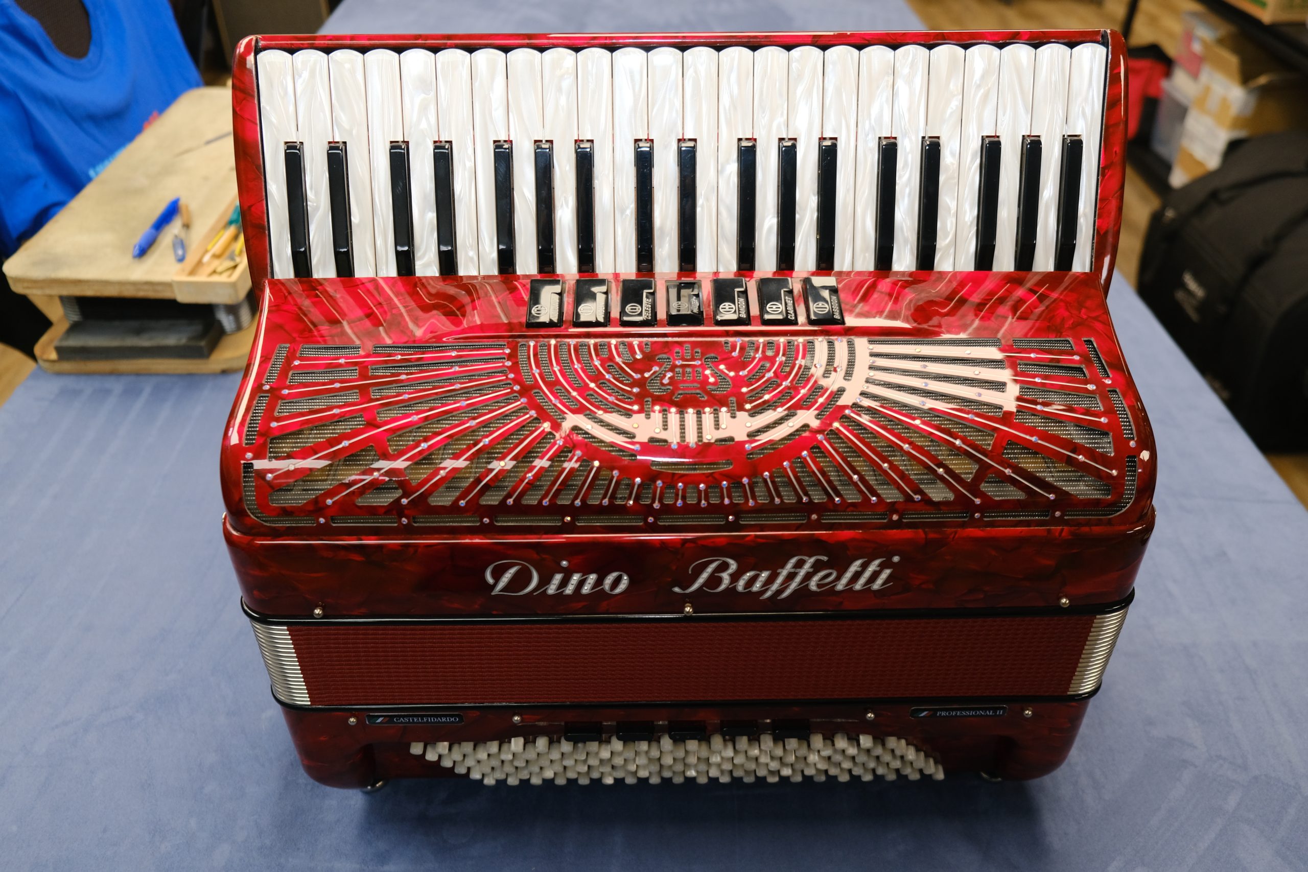 Dino Baffetti Professional II in Red. 3/5 sets of hand made Artigiana reeds. LMM.. No chamber. Full 41 keys and 120 bass. This is a lovely light weight instrument with Red pearl finish and mother of pearl keys and buttons. 7/5 registers.
